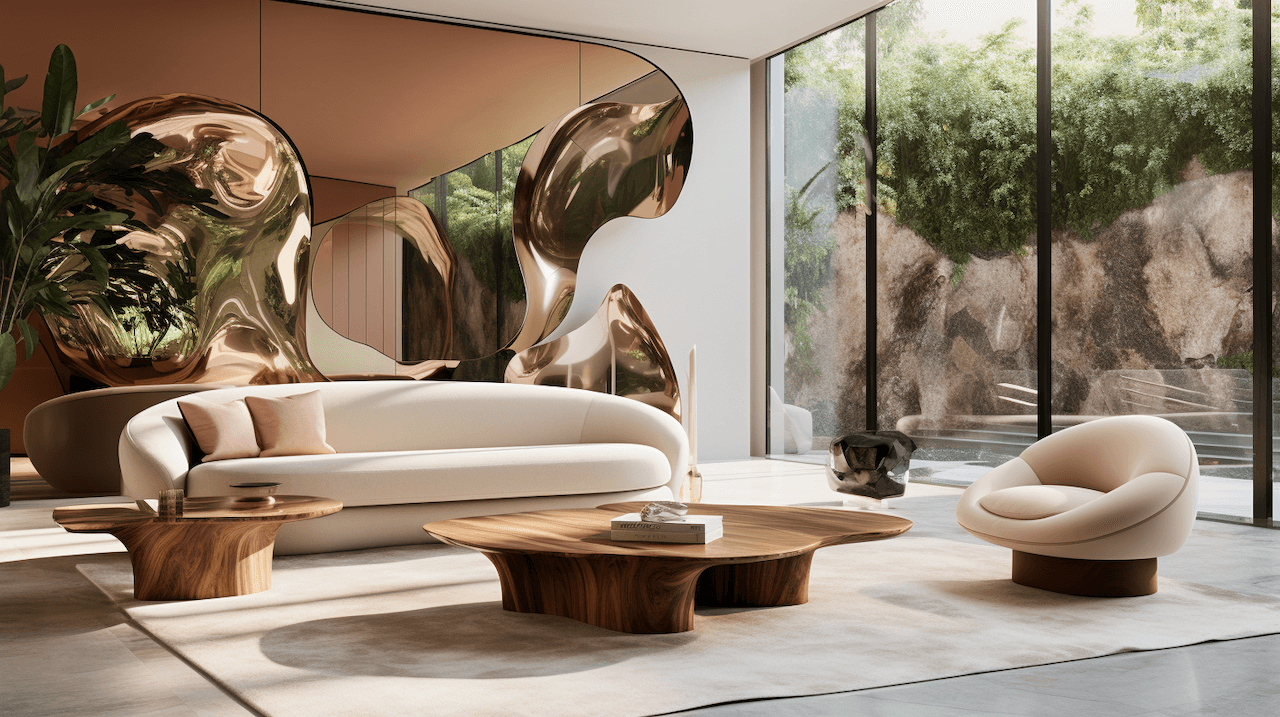 Show a room with oversized vases, sculptural furniture, and quirky decor pieces for a sophisticated yet whimsical look.
