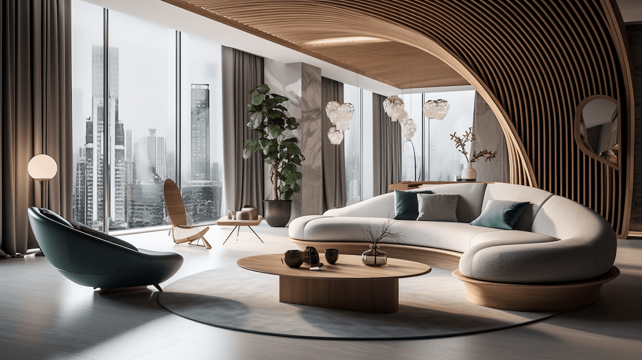 Illustrate interiors with organic-shaped, curvilinear furniture that offers comfort and visual appeal.
