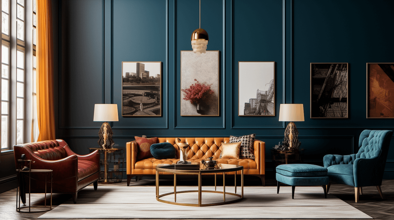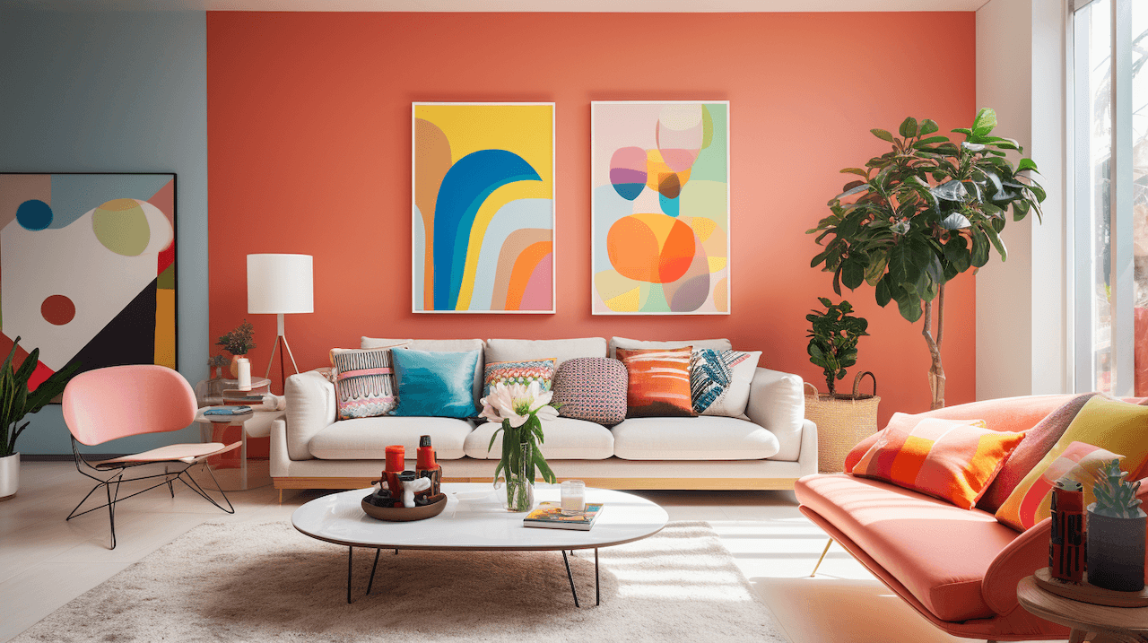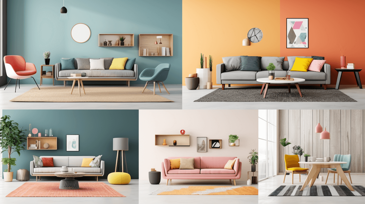 Showcase interiors with the color trends of 2024, including beige and ivory with modern textures, playful colors like bubblegum pink and bright turquoise, retro hues like mustard and olive, dual-tone color schemes, soft black, and Parisian gray.